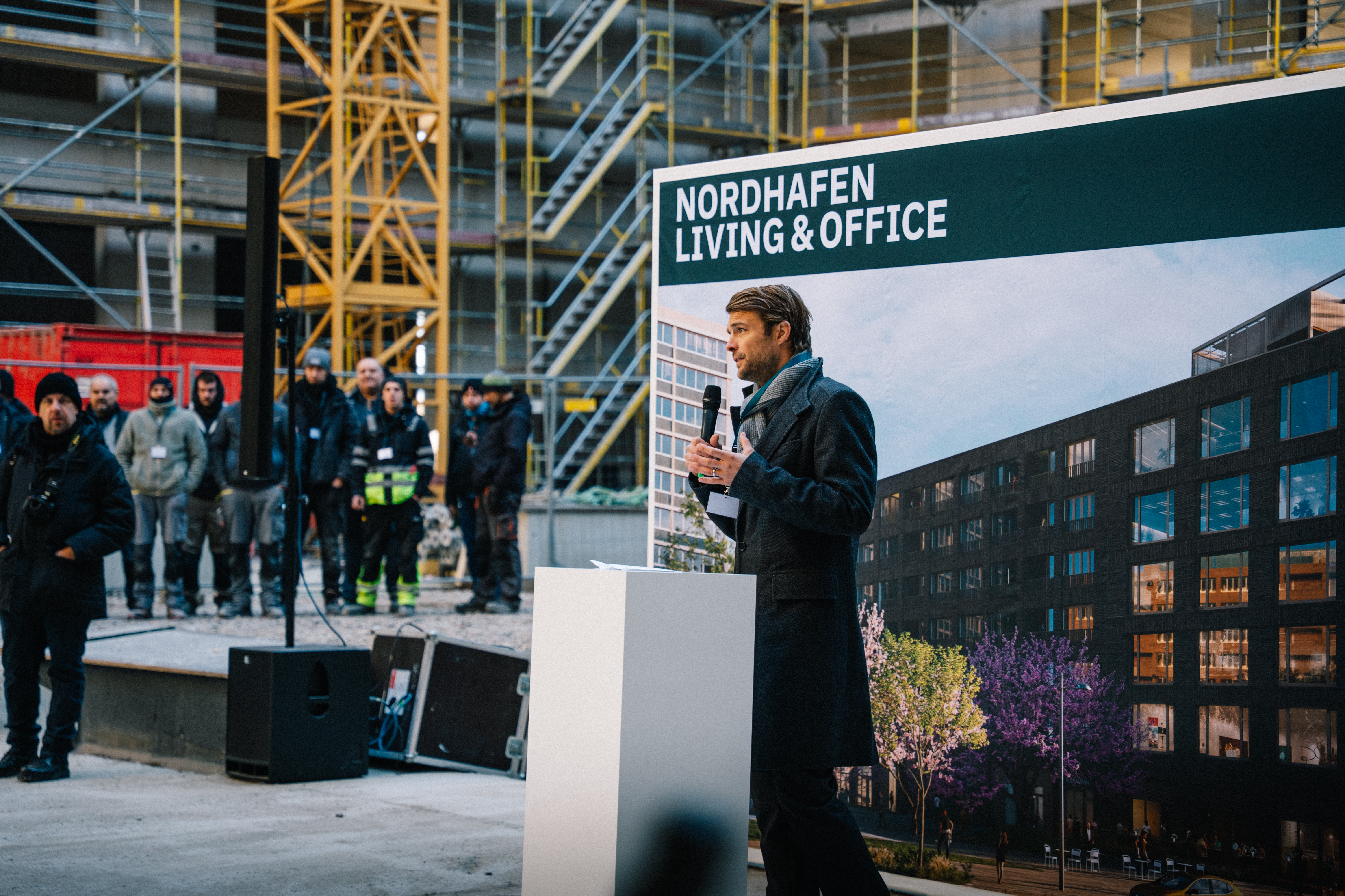 Slávnostné dokončenie hrubej stavby projektu Nordhafen Living & Office. Dôležitý míľnik v Berlíne.